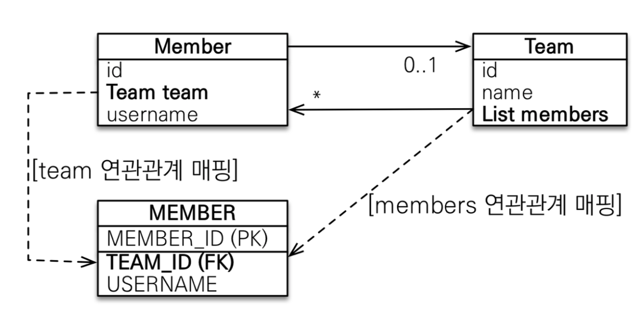 : 엔티티들은 서로 관계가 구성되어 있다. (Team 엔티티와 Member 엔티티 -> Team은 여러 MEmber를 가지는 관계이다. )객체의 참조와 테이블의 외래키를 매핑