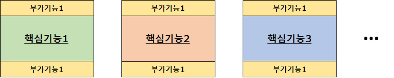 | 핵심 기능이 100개일 경우... 모두에 동일한 내용의 코드 추가 필요 핵심 기능 수정 시 핵심 기능 이해를 위한 부가기능까지의 이해 필요 부가 기능의 변경 필요시 핵심 기능의 개수만큼 부가 기능도 수정해야 함. |