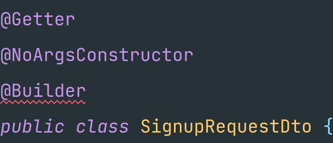 추가를 했는데.. 이젠 어노테이션이 에러가 생긴게 문제였다. 그래서 다시 원래 상태로 되돌리고 튜터님을 찾아갔는데 @Builder를 추가해야한다 하셔서 이게 맞는데 왜 에러가 났는지 더 찾아보다가 결국은 다시 질문을 드리게 되었다.