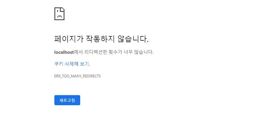 동일한 페이지가 무한히 반복될때 출력되는 에러 메시지라고 한다. 회원 관리 기능에 카카오정보를 불러와서 사용하는 기능을 구현하다가 생겼으니 그 부분에 문제가 생긴 듯 싶다.